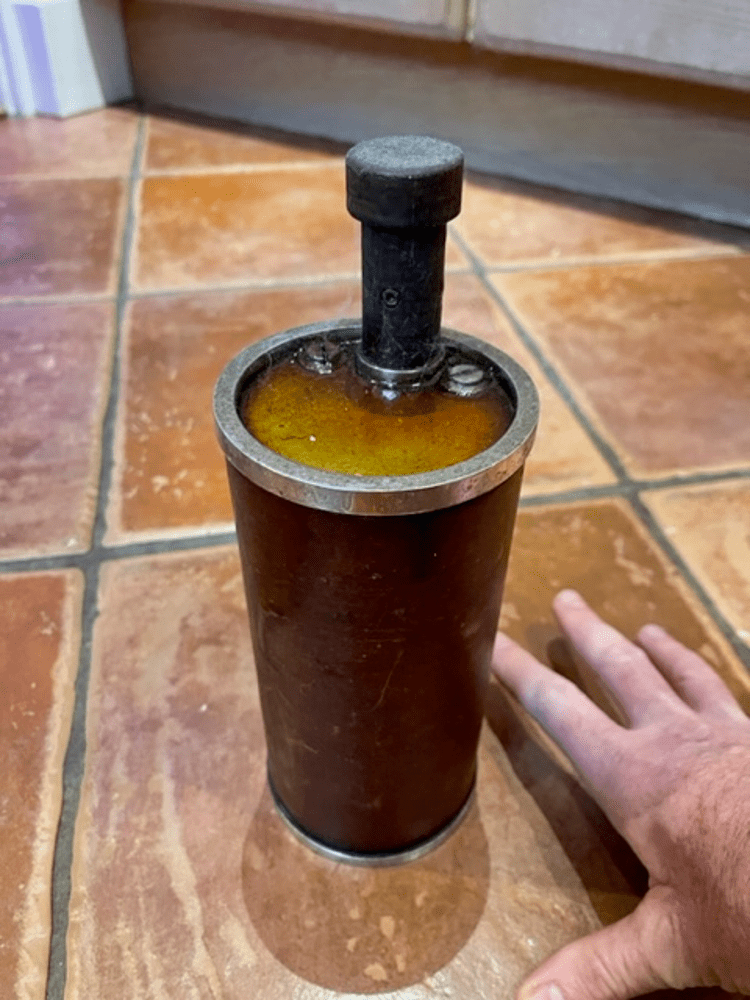 There is some strange sticky/oily liquid that seeps out of it. I don’t know that this is, although I do remember him saying it was dangerous and we shouldn’t lick it. I was probably in my teens by that stage though and would already have done all my licking of WWII bombing devices by then.